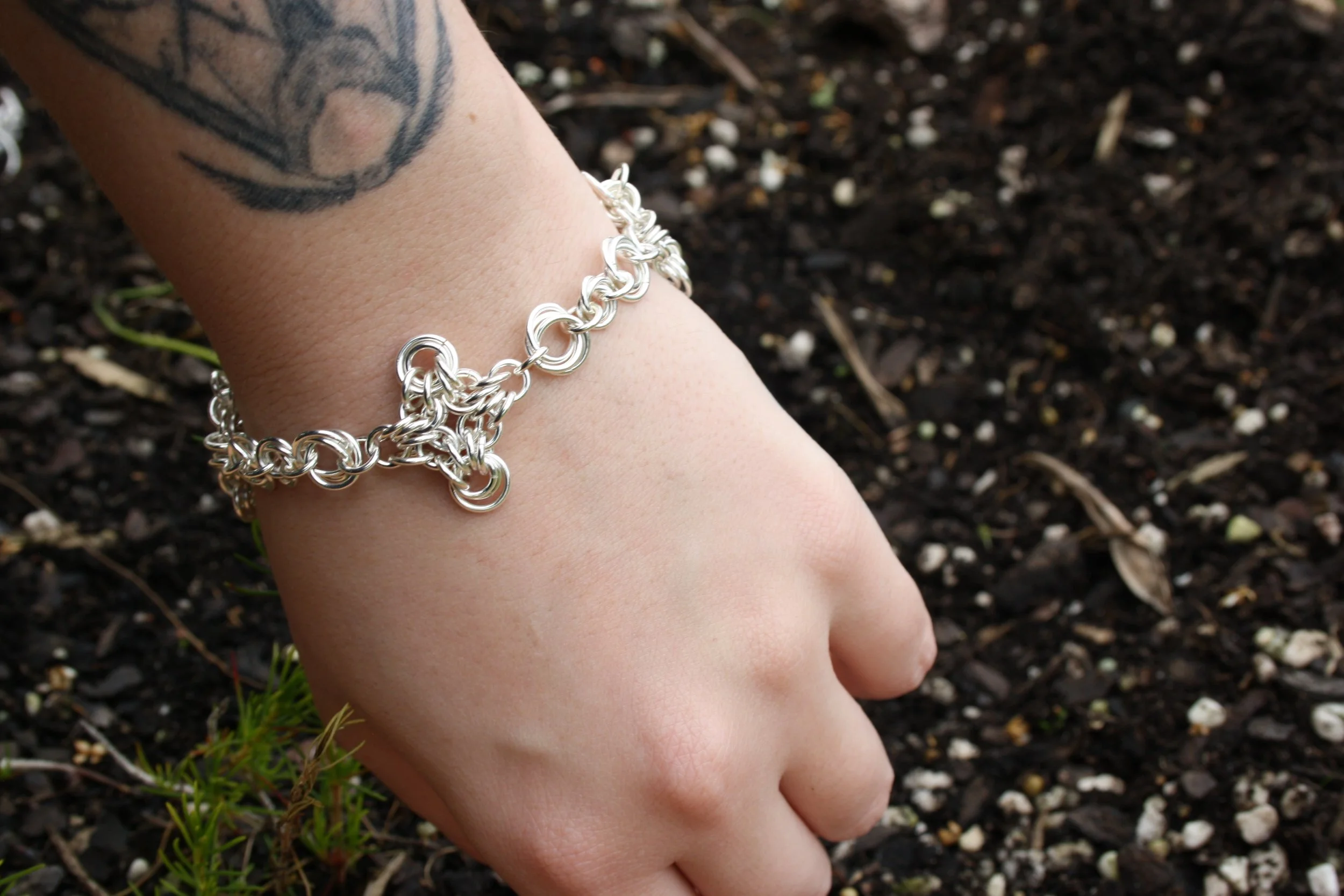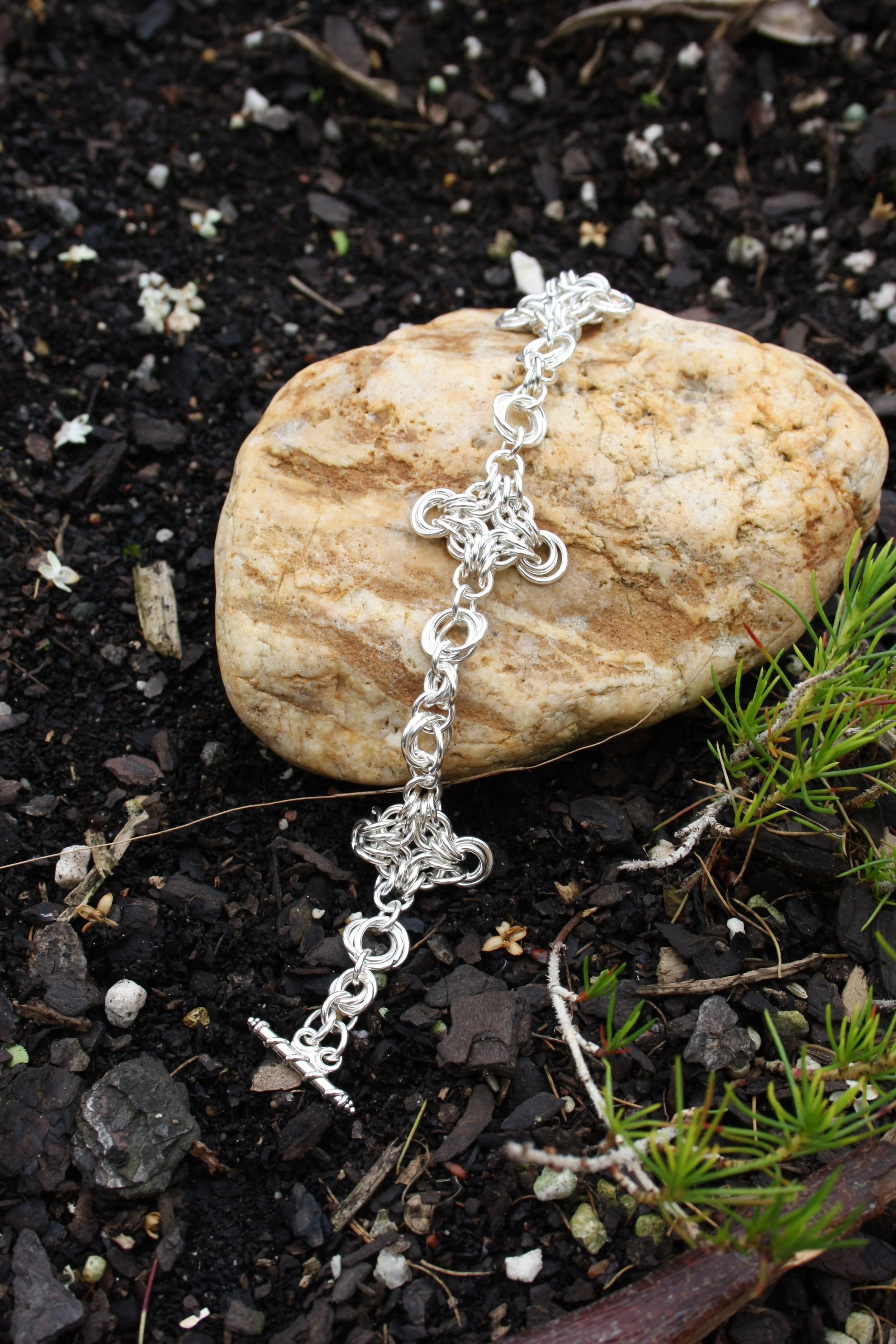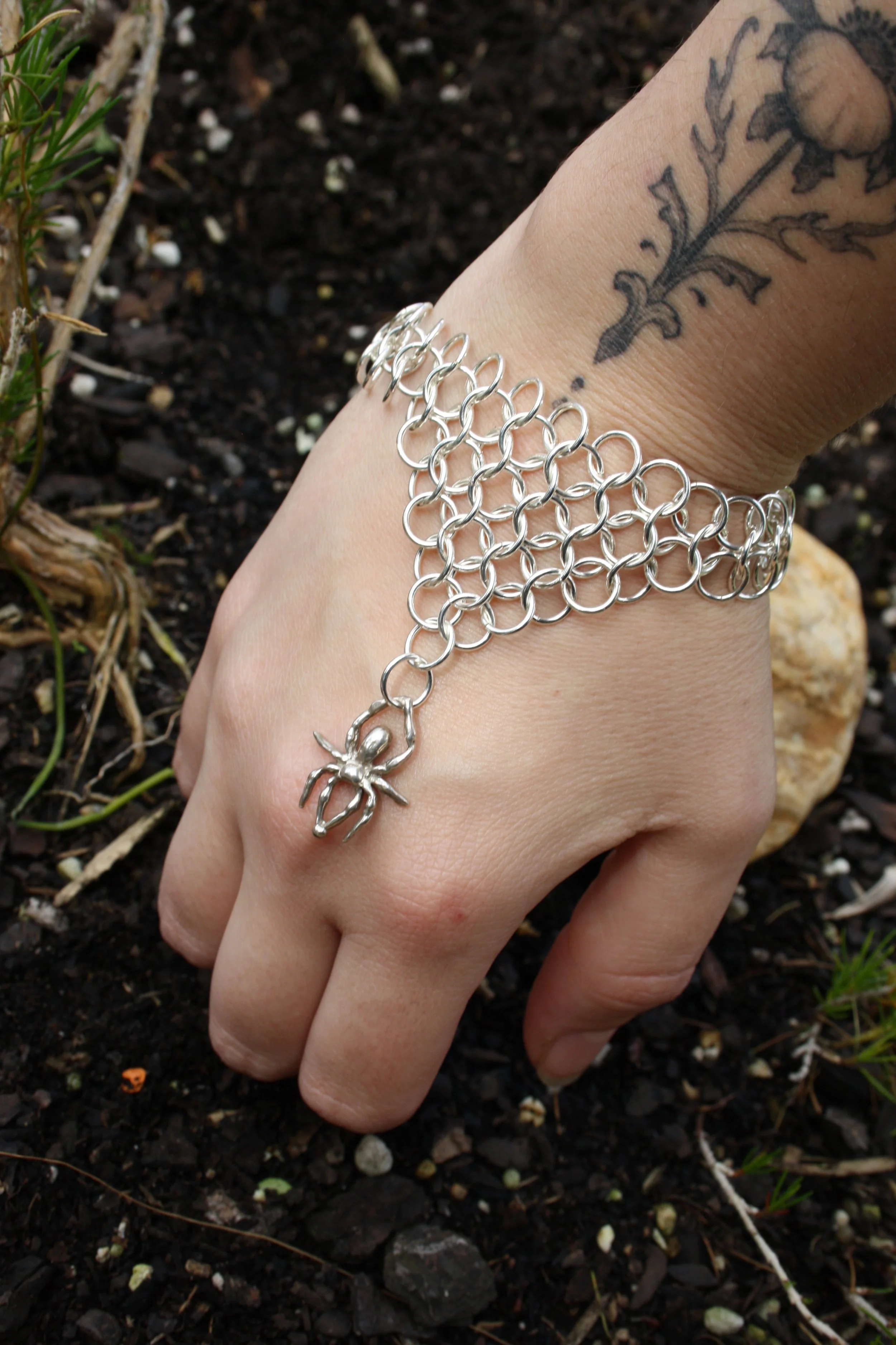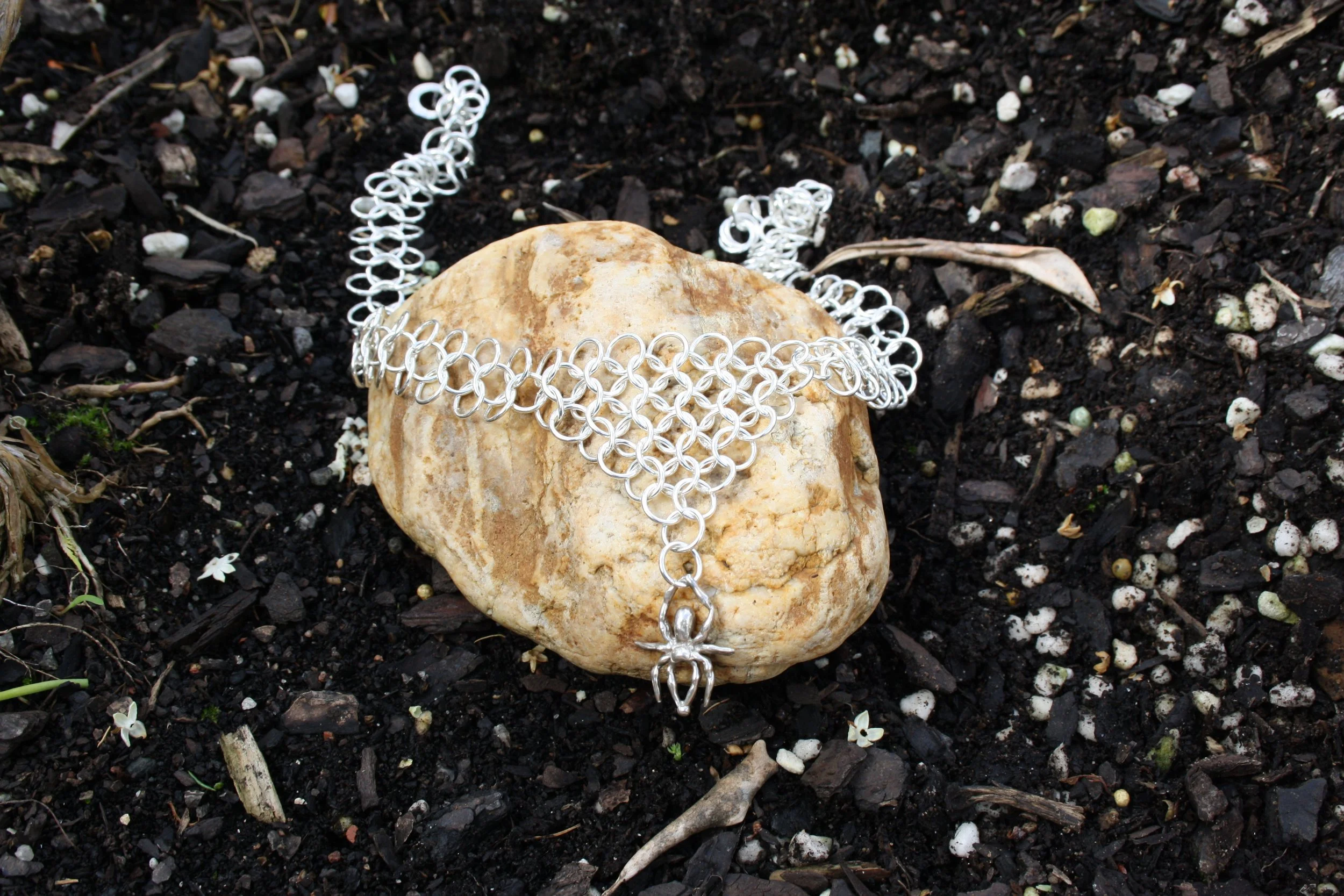 This bracelet is made from anodized aluminum jump rings and sterling silver spider charm.