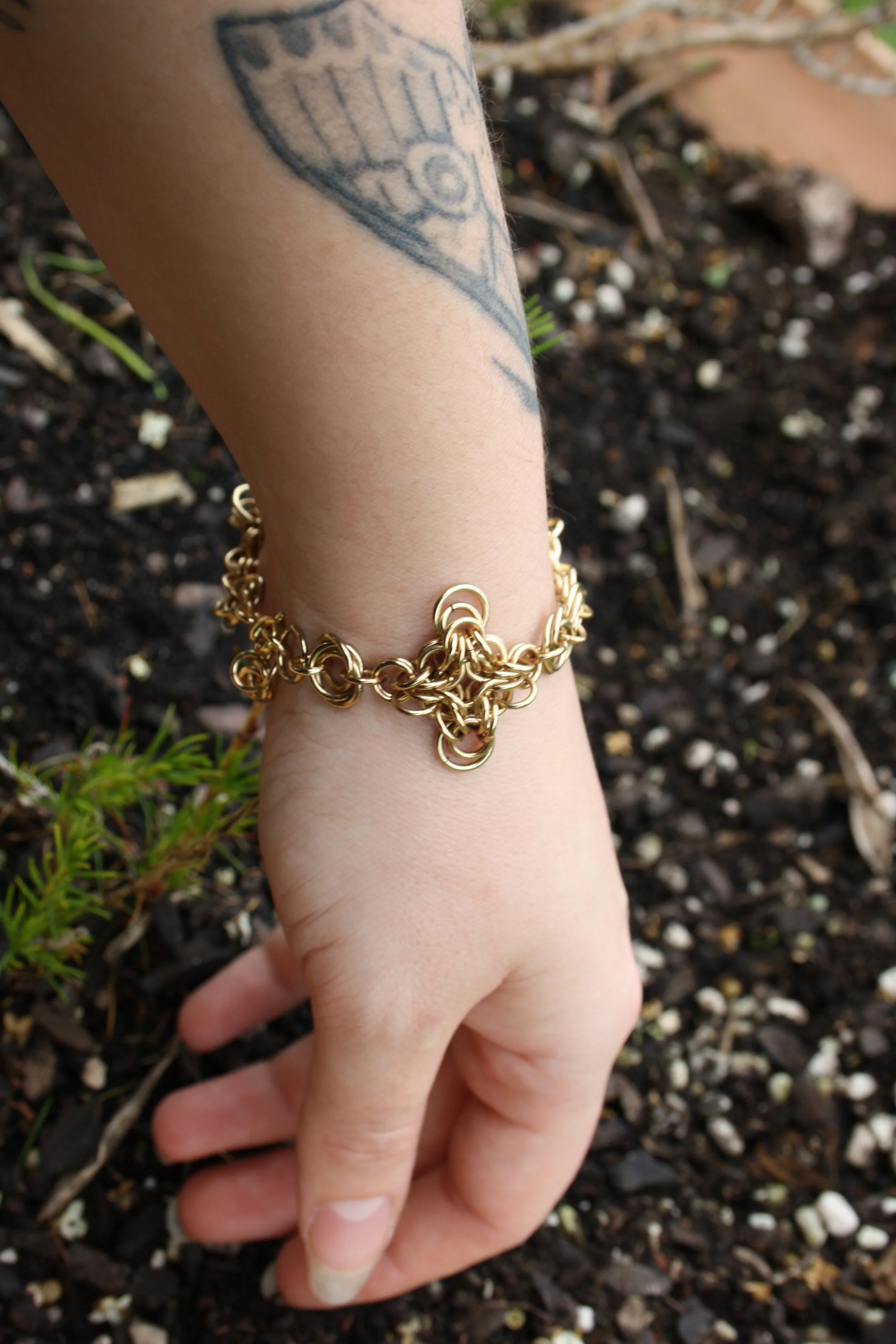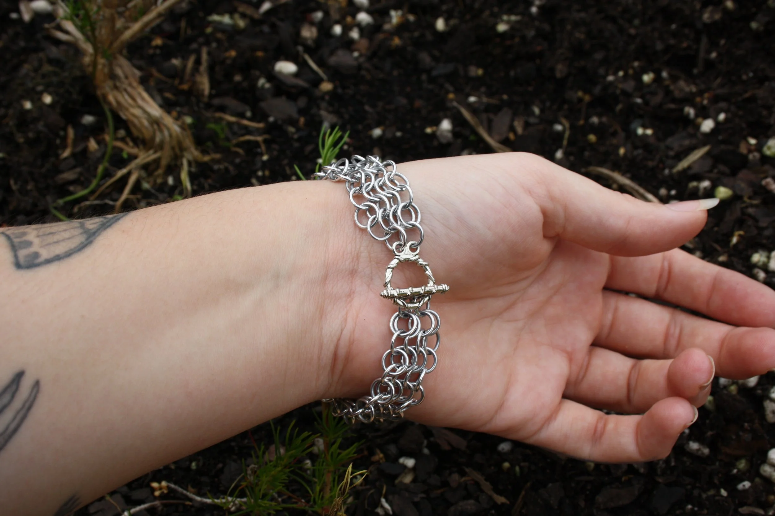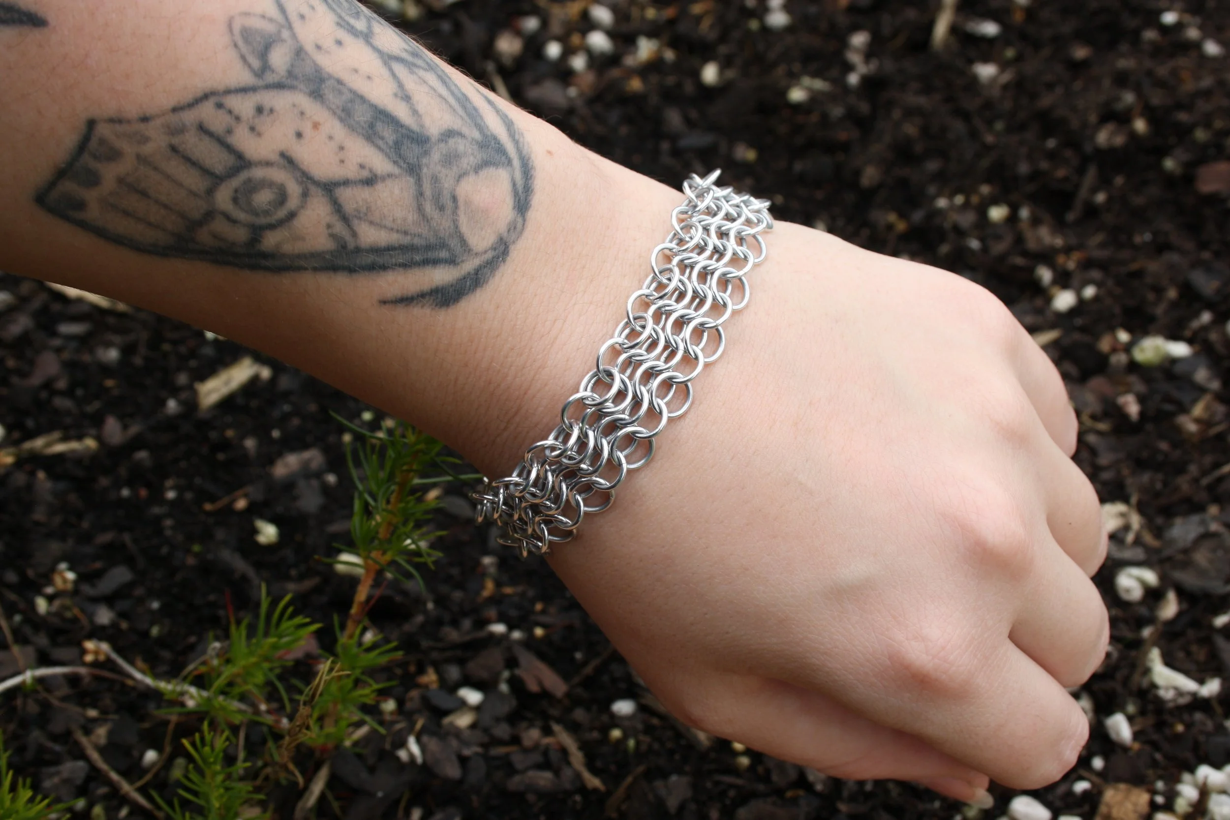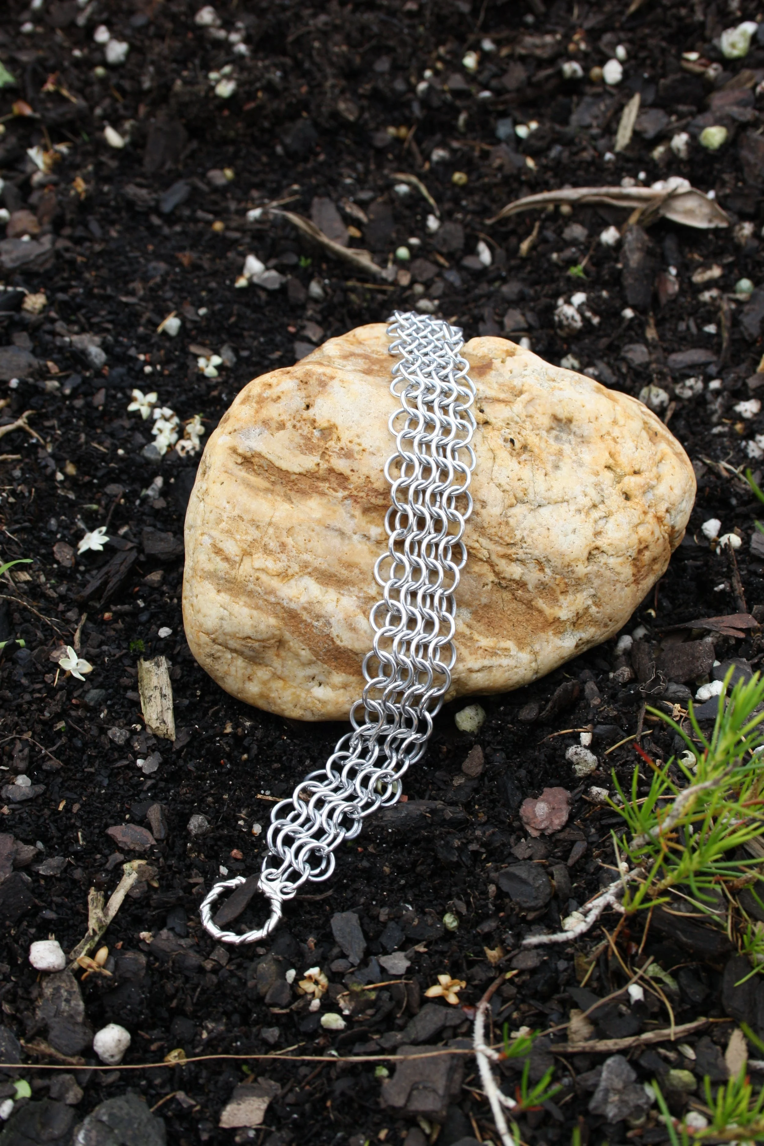 This bracelet is made from anodized aluminum jump rings and sterling silver spider charm.